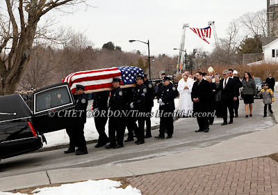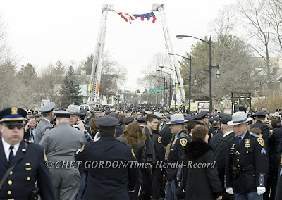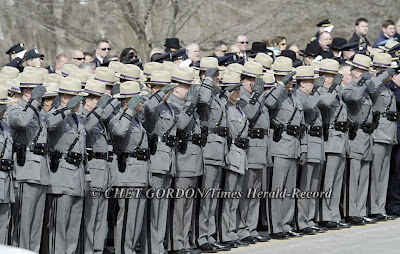 Law enforcement officers salute as the hearse bearing the body of Poughkeepsie police officer John Falcone proceeds along Gleneida Ave. after his funeral services at St. James the Apostle Church in Carmel, NY on Thursday, February 24, 2011. Officer Falcone is the City of Poughkeepsie police officer who was killed in a shootout last week at the Poughkeepsie Metro-North Railroad station. CHET GORDON/Times Herald-Record