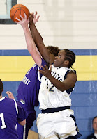 It’s good to be back inside shooting sports again, particularly an early season big game here close to home. Managed to arrive early in a familiar gym, put a few studio strobes on stands in the corners at one end of the court and added a small Canon 550-EX strobe clamped up in the stands near half-court to give a little more light in the back court, as a lot of good images like rebounds, dunks, and just plain good “filers” of the starting guards bringing the ball upcourt are always good to make with the 300mm at the other end of the court.