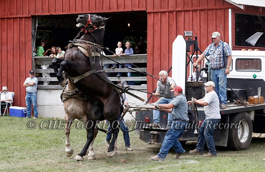 Doug Smith (seated on weight truck) of Richford, NY struggles to control his horses in the 2800lb. Draft Horse Pull during the 131st. Annual Little World’s Fair in Grahamsville, NY on Saturday, August 14, 2010. CHET GORDON/Times Herald-Record