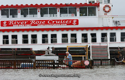 NEWBURGH, NY. A woman examines debris onshore near The River Rose, and original paddle-wheel boat moored along the flooded Hudson River waterfront in Newburgh, NY on Sunday, August 28, 2011. Hurricane Irene knocked out power from South Carolina to Maine, and parts of New York State saw more than a foot of rain. © Chet Gordon/THE IMAGE WORKS