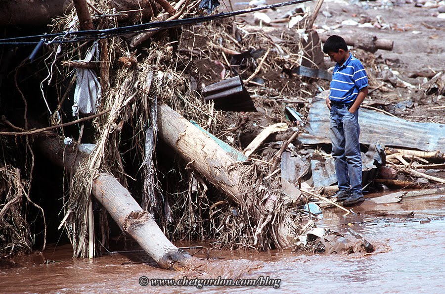 TEGUCIGALPA, HONDURAS. A young boy pauses near a car covered with debris along the bank of the Rio Choluteca (Choluteca River) under the El Chile Bridge in Tegucigalpa, Honduras on Saturday, November 7, 1998. Hurricane Mitch left upwards of 11,000 dead and hundreds of thousands homeless in Honduras, Nicaragua, Guatemala and the rest of Central America. Floods and mudslides have leveled houses, buried villages and washed out major roadways and bridges, cutting off the northern and southern regions of Honduras. © Chet Gordon/THE IMAGE WORKS