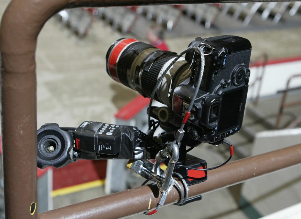 Remote Canon 5D-MKII w/ 70mm – 200mm f/2.8AF mounted in the mezzanine seating during the NYSPHSAA State Championship Tournament at the Glens Falls Civic Center in Glens Falls, NY on Friday, March 16, 2012. The rig is fired by Pocket-Wizard Multi-Max syncing with a full set of Dyna-Lite Uni-Jr. 400 strobes to light the arena. CHET GORDON/Times Herald-Record