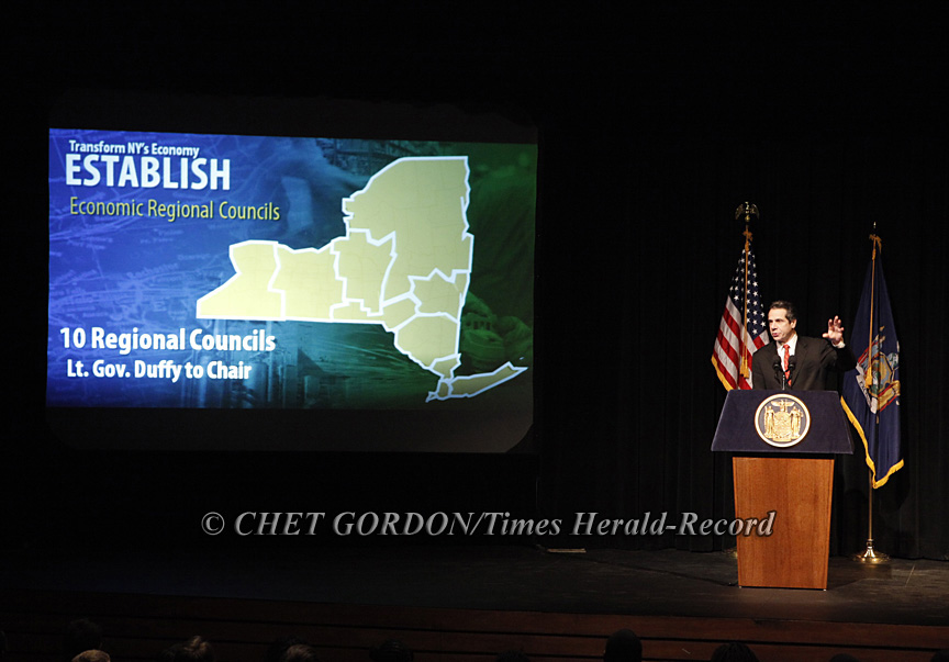 Cuomo (right) spoke at Marist College near me in Poughkeepsie, NY in the college’s student center theater. The small theater was dimly lit for the governor’s powerpoint presentation, which was a shortened version of his State of the State address a few weeks ago up in Albany, the state capitol. The theater was overcrowded with all the local politicians and businessmen from the Hudson Valley area our paper covers, so I easily recognized a lot of the “movers and shakers”, and they me. Parking was a nightmare on campus on this January morning with temps in the mid-20º’s, and like most of the audience, I was forced to park literally a half mile or so from the student center. Fortunately I’d kept our pool 300mm f/2.8AF with me all weekend since covering a high school track meet over the weekend, as well as both the 1.4X and 2X tele-converters. I knew instinctively to bring along those “TE’s” on that long walk across campus with three bodies, etc. I’d also packed my compact, two-step step stool, anticipating that I might need it on the press risers if they were set up for us in the theater. When I arrived upstairs, and was hustled into the theater by a few of the governor’s PR people and given the visual “once over” by more than one NY State Trooper, I stopped the PR guy at the back of the theater, literally in the shadows, and told him I preferred to work from the back of the house, as I wanted to be eye level with the podium, and of course the main subject, the governor. That was the main reason I’d brought along the “3” (300mm), the tele-extenders, a sturdy monopod, and of course plenty of chewing gum… (the step stool remained in the car, as there was no way I’d be able to hustle across campus to retrieve it unless I truly needed it in a pinch. No way did I want to get locked into the corner of the theater at stage level and only have the opportunity to photograph the governor by looking up at him from a side angle, as what some of us in the business call a “nose – bleed” view. Anyway, long story short, I managed to work from the back row of the theater, squeezed in between members of the general public who were also forced to stand in the shadows of the theater, and along the walls. There were even a few professional looking folks sitting in the aisles I’d noticed when the governor began his talk. Throughout the governor’s speech I was able to change lenses (barely) make the wide images on a second camera; an older Canon 1D with the 28mm – 70mm lens at ISO 1600. By viewing those images on the camera’s rear viewfinder, I knew I’d have to switch out the 300mm on the Canon 5D – MKII, to make images with the 28mm – 70mm zoom as well. Oh yea, I was also required to shot a few short minutes of video with the 5D – MKII as well. That’s another good reason why I choose to shoot from the back of the house, and particularly on the long lenses. I started initially with the 300mm at ISO 3200, and by the time the governor’s speech was winding down, I’d upped the ISO to 4000 and my basic exposures were anywhere from 1/40th. sec. to 1/125th. sec. depending on which lens / tele- extender combination I was using. Here’s a few of the favorites I made from my standing position against the back row of filled seats. ~cg.